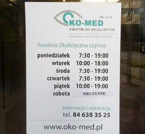 "Bardzo dobra organizacja przychodni okulistycznej w Zamościu. Sympatyczna i profesjonalna obsługa, informuje co dalej po zabiegu. Miejsce klimatyzowane. Przed lokalem parking."